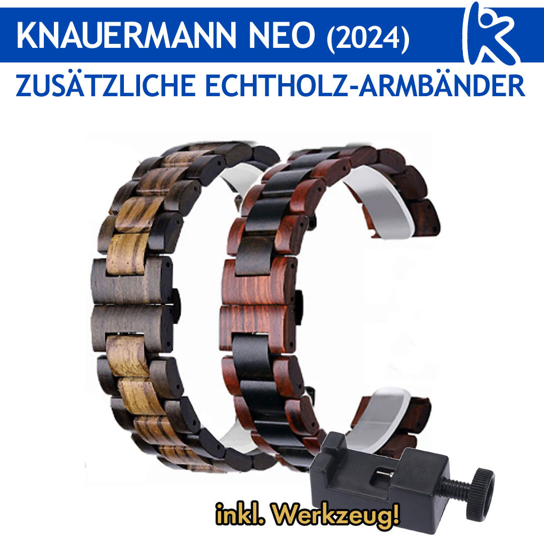 - 25 Armbänder: Weiches Silikon, edles Milanaisedesign, hautfreundliches Textil, exklusives Titan oder individualistisches Echtholz - bei Knauermann wird jede(r) fündig. Das Beste: Die Armbänder können dank Klickschnellverschluss binnen Sekundenschnelle ohne Werkzeug gewechselt werden und für die Gliederarmbänder (Edelstahl, Titan, Echtholz) gibt es Verlängerungssets für starke Handgelenke bis 33cm.