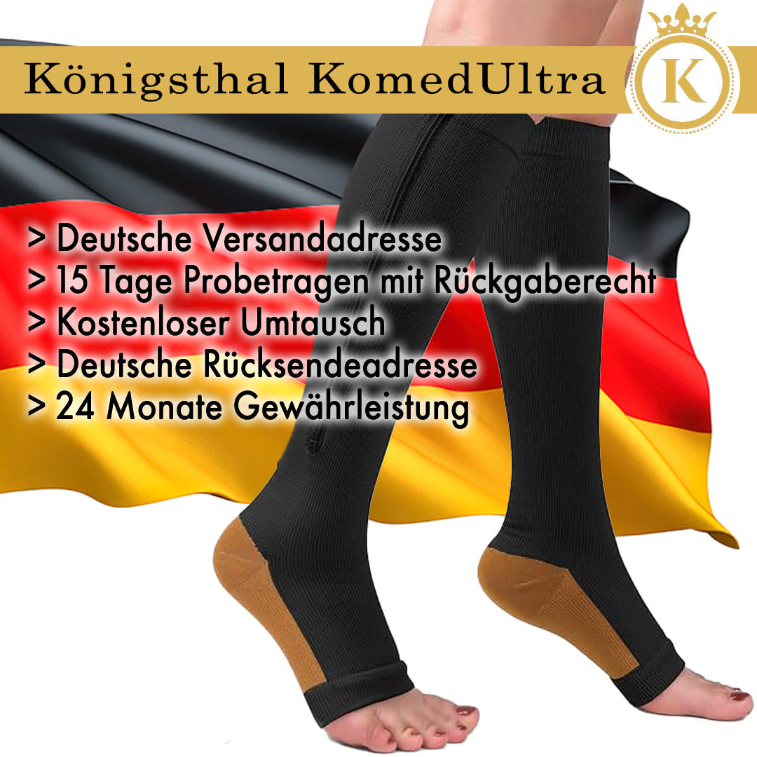 Aber die KomedUltra von Königsthal könenn noch viel mehr: Das spezielle Gewebe - die zweite Komponente - an der Unterseite sorgt bei Bewegung quasi für eine Eigenmassage. So üben die KomedUltra nicht nur Druck aus wie gewöhnliche Kompressionsstrümpfe, ein wenig Bewegung bringt Ihnen aktive Linderung und damit auch wieder mehr Lebensfreude durch körperliche Bewegung.